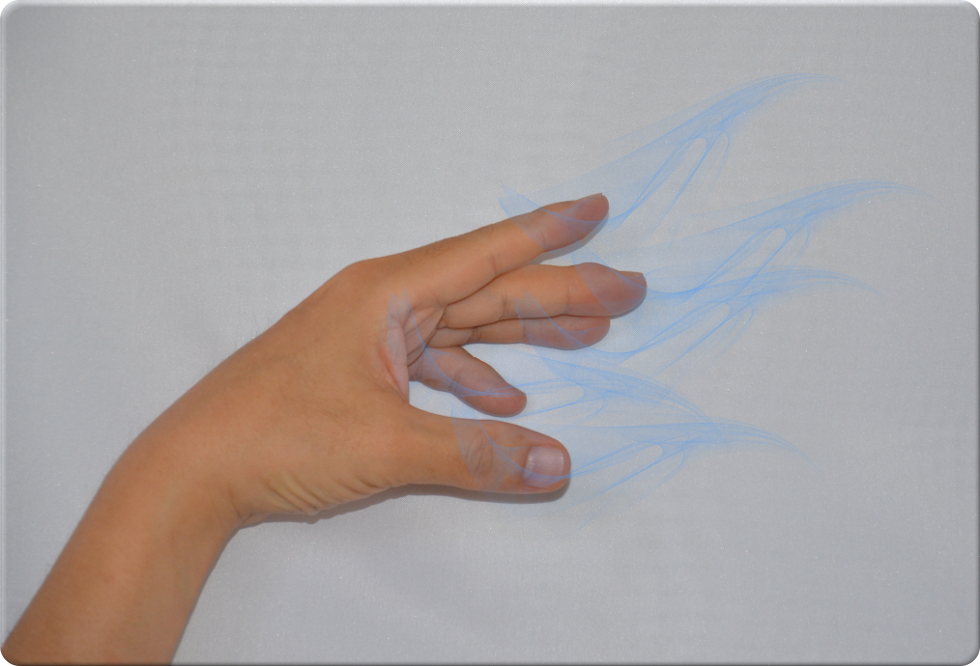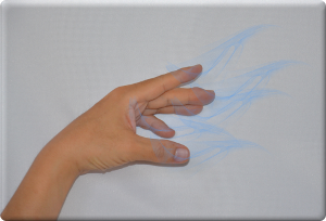 もう少し意識を集中すると、粒子の密度が濃くなって煙のように見え、指先に太くゆるやかにまとわりついたり、向かい側の手の平に流れていったりします。このときも粒子のツブツブは見えます。これは最初からあったエネルギー(流れていたエネルギー)が意識の変化によって見えるようになってきているのではないかと思います。