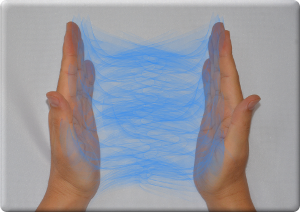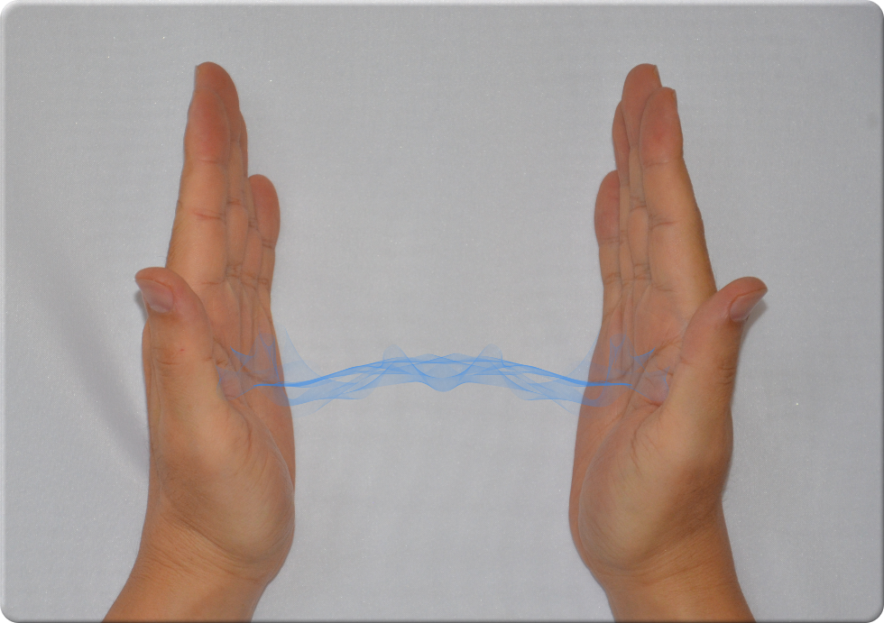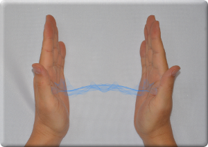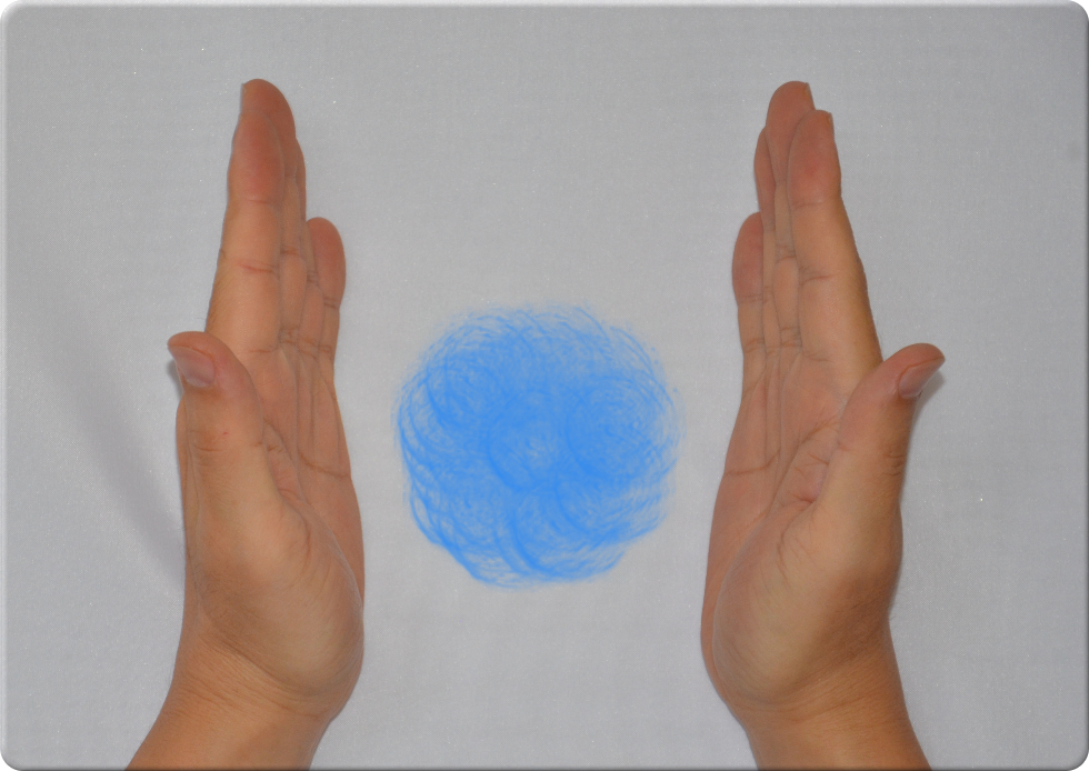 最初に向かい合わせた手の平全体で両方からエネルギーを向かい側に流します。エネルギーどうしはぶつかることなく反対側の手の平に当たります。この様子が左図です。